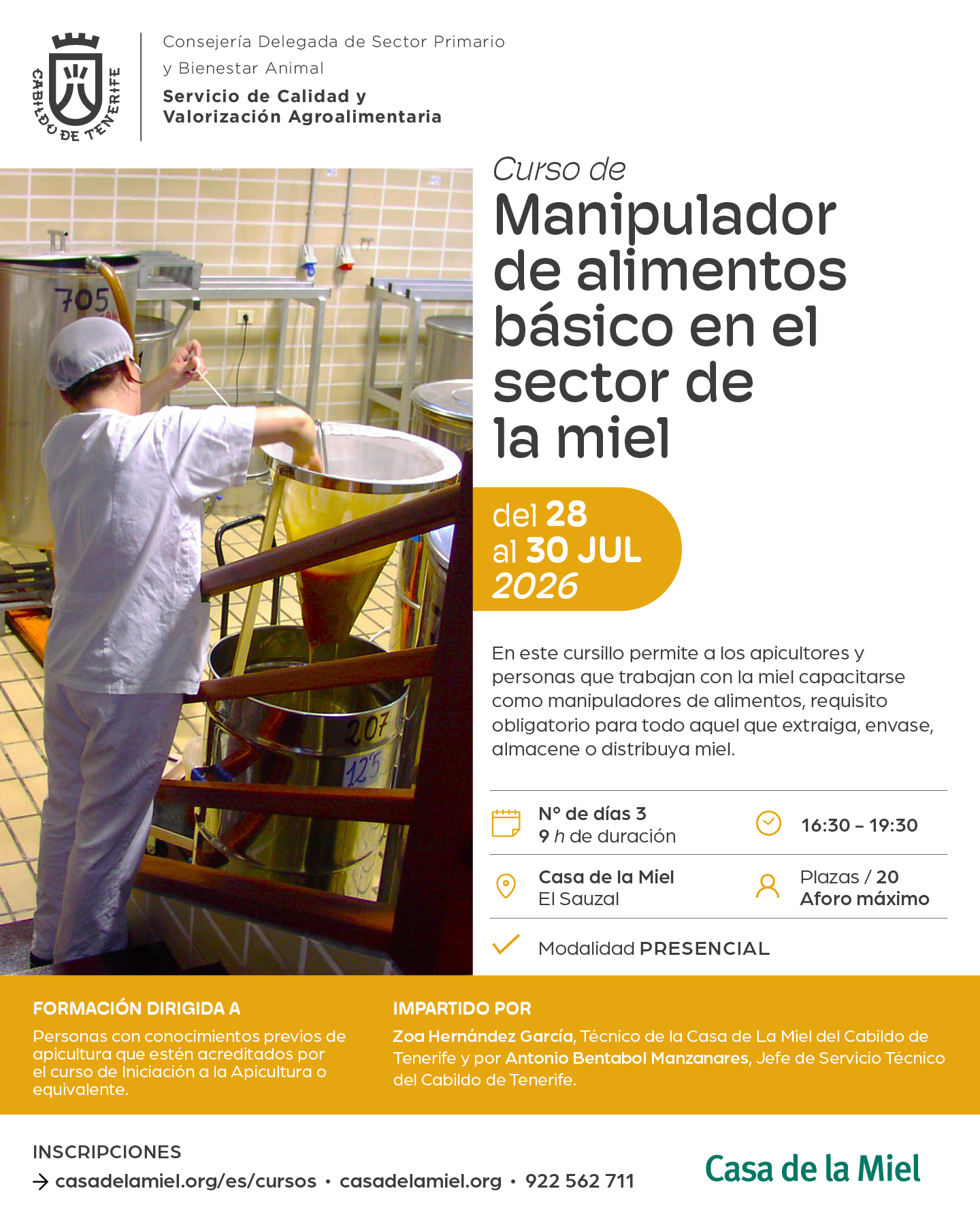 Correrá a cargo de Técnicos de la Casa de la Miel del Cabildo de Tenerife. Se celebrará en las instalaciones de la Casa de la Miel y tiene una duración de 7.5 horas lectivas en horario de tarde, de 16:30h a 19:00h.