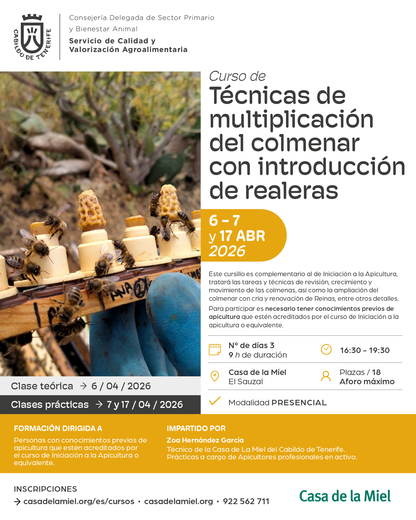 Correrá a cargo de Dª Zoa Hernández García, Técnico de la Casa de la Miel del Cabildo de Tenerife y de apicultores profesionales.
